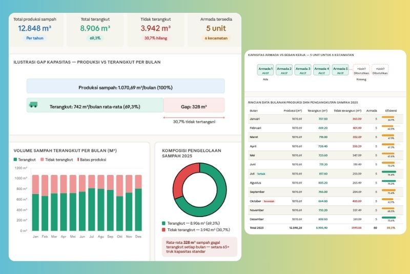 Matematikanya tidak pernah berhasil. Setiap bulan rata-rata 328,69 m³ sampah gagal terangkut – setara lebih dari 65 truk kapasitas standar yang dibiarkan kosong tanpa bergerak.