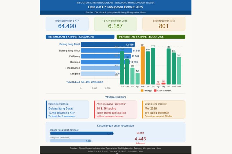 Dinas Kependudukan dan Pencatatan Sipil Kabupaten Bolaang Mongondow Utara merilis data mengejutkan sepanjang 2025: total 64.490 dokumen e-KTP tercatat sebagai kepemilikan aktif warga, sementara penerbitan baru mencapai 6.187 keping – dengan fluktuasi ekstrem yang mencapai titik terendah hanya 18 keping di bulan Agustus. Data e-KTP Bolaang Mongondow Utara 2025 ini sekaligus membuka potret ketimpangan layanan kependudukan yang perlu segera dibenahi.