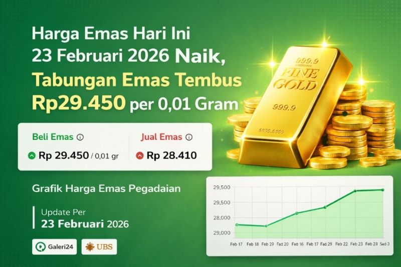 Harga Emas Hari Ini 23 Februari 2026 Naik, Tabungan Emas Tembus Rp29.450 per 0,01 Gram