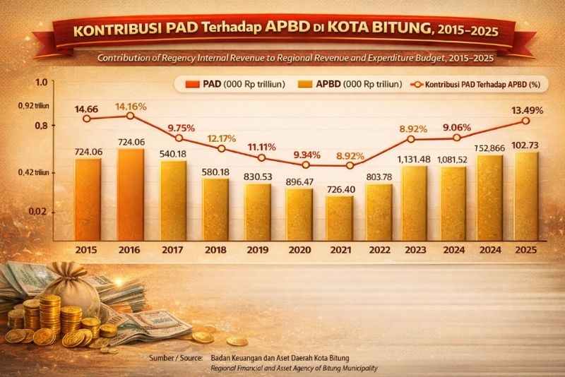Data 10 tahun terakhir memperlihatkan perjalanan fiskal yang penuh dinamika. Kontribusi PAD terhadap APBD Kota Bitung sempat menyentuh puncaknya pada 2015 sebesar 14,66% dengan PAD Rp106,13 miliar.